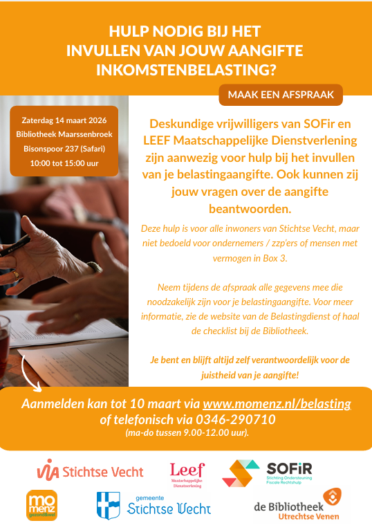 Op zaterdag 14 maart 2026 staan deskundige vrijwilligers van SOFir en Leef Maatschappelijke Dienstverlening voor je klaar in de Bibliotheek Maarssenbroek (10.00 – 15.00 uur).